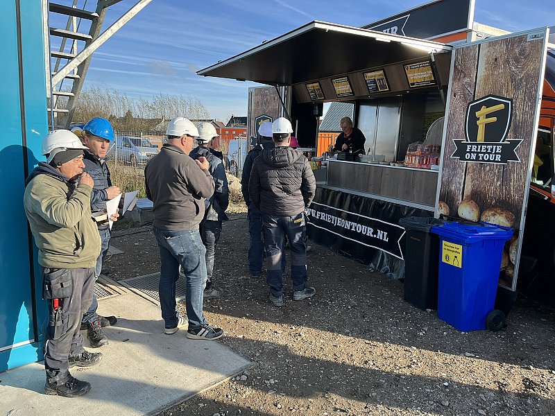 05-12-2025 – Donderdag 4 december bereikte de bouw van Droomweide fase 1 in Meerkerk het hoogste punt. Een mooie gelegenheid om het bouwteam van bouwbedrijf Reinbouw en de onderaannemers in het zonnetje te zetten. Samen met hen genoten we van frites en snacks als blijk van onze grote waardering voor het prachtige werk dat ze verrichten!